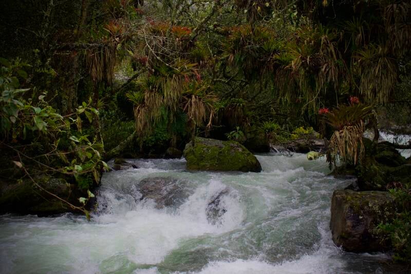 We departed at 7:00 AM, following the river downhill. For the first 1.5 hours, it was dry. The valley was beautiful, with trees covered in bromeliads and many waterfalls. However, things got sketchy as we got closer to Cashapampa. The trail had suffered from landslides, making it dangerously narrow and unstable in places. There were steep drop-offs at around the 2.5 km mark, and with the loose rocks and slippery mud, we were extremely grateful for our trekking poles. Of course, the rain returned before we could finish, coming down nonstop for the last stretch. We reached Cashapampa at 11:00 AM, absolutely drenched and relieved to have finished the trek.