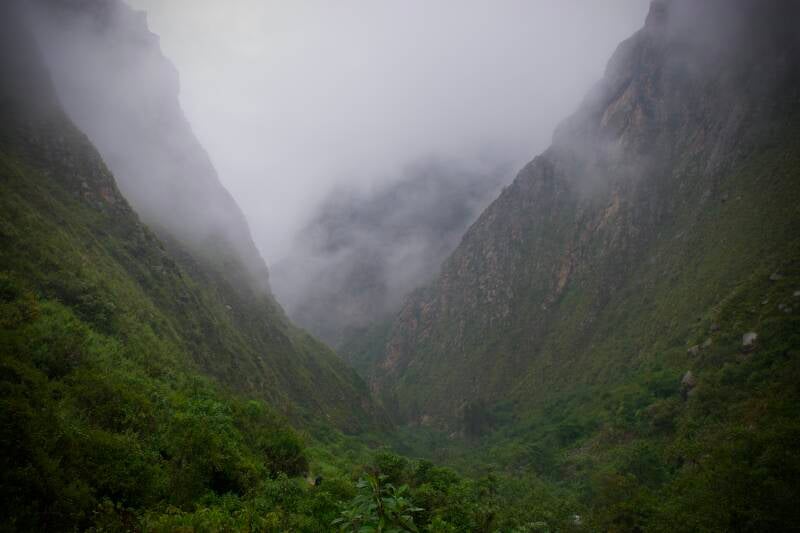 We knew this was going to be the hardest day, and the weather made sure we didn’t forget it. We left at 8:00 AM, hiking through the Huaripampa Valley, which was supposed to be beautiful, but again, rain and fog obscured most of it. The trail climbed steadily at first, but as we got closer to Punta Unión, it became steeper, rockier, and more exhausting.